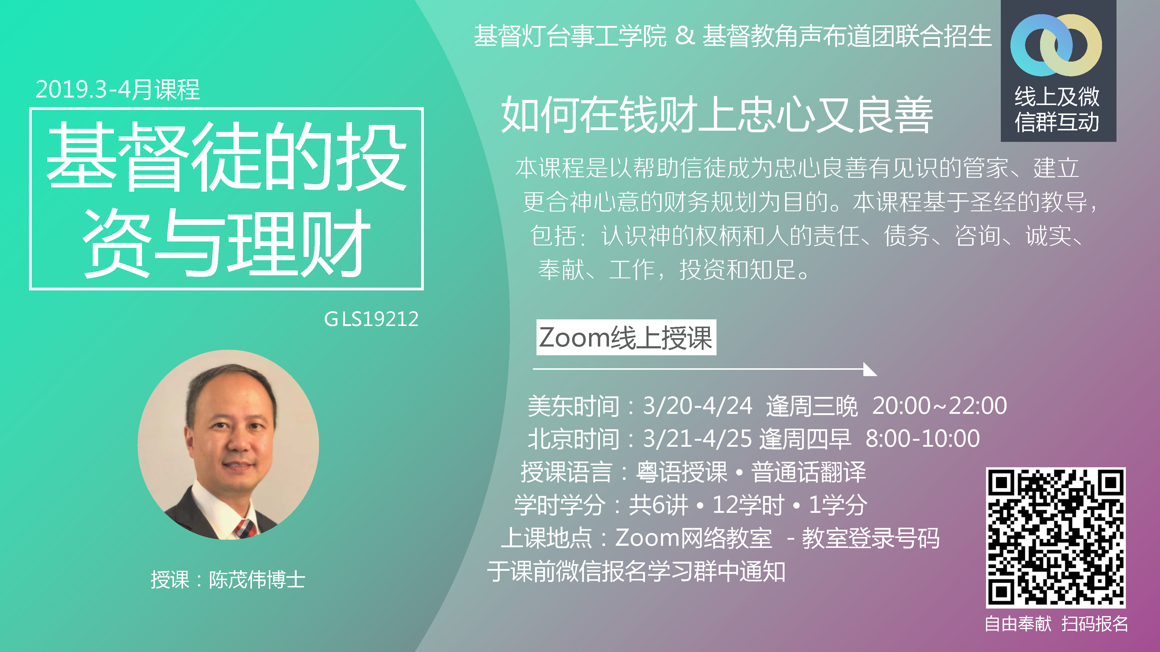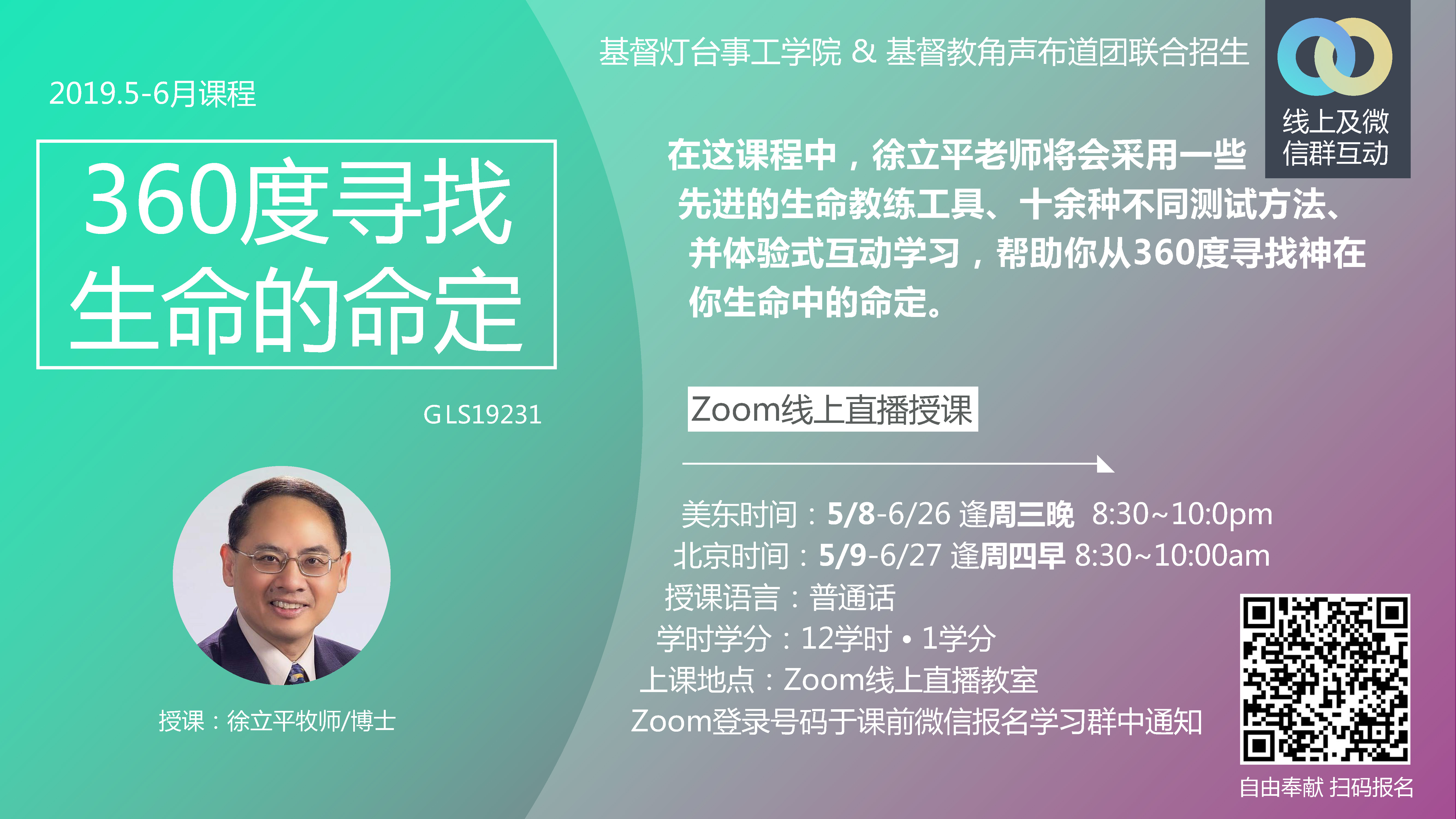 課程介紹 本課程是為裝備有意委身帶職宣教的信徒。通過閱讀、短講、案例分析、問題討論、異象分享、彼此代禱,去探求和了解有關帶職宣教的神學、歷史、定位,和方式等理念。課程特別注意一些實際問題,如:清楚宣教的動機和呼召;合宜的職業身份或營商平台,與母會、差會、家庭和同工的關係;宣教士的屬靈操練等。 報名條件 信主受洗三年以上; 在教會有固定的服侍崗位一年以上; 有委身跨文化宣教的感動和呼召; 中英文溝通能力。 上課信息 美东日期:2018年11月14 – 12月26日(逢周三晚间) 美东时间:8:30-10:00 pm 北京日期:2018年11月15 – 12月27日(逢周四上午) 北京时间:9:30-11:00 am 课时:7次/10.5小時 学分:1学分 学费:自由奉献 地址:Zoom课堂 报名: GLS 微信课程通知群和 報名鏈接:https://drive.google.com/open?id=1Bb1VynFUSqpqJ_jkDaNMkBGvTLzFDGaKr2PY99BRZ40